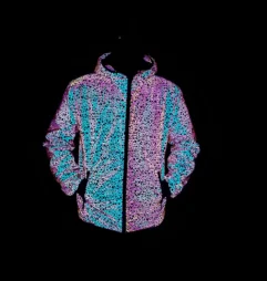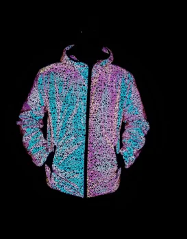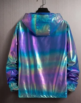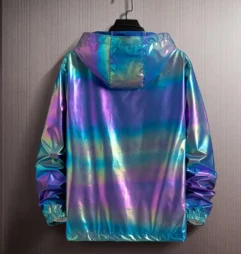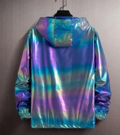 Make sure you are hard to lose on the dance floor with one of these cool holographic windbreakers. This metallic jacket features a unique design that creates a shiny look that will make you stand out from the crowd. A metallic jacket can be paired with sequins pants, leather pants or ripped jeans for a dystopian, neon Mad Max style look. Made from a light weight, breathable polyester, and featuring a large hood for comfort. We have several colour options to pick from. Available in white, light green, blue and grey. Pick one up today and take your next festival get up to the next level.