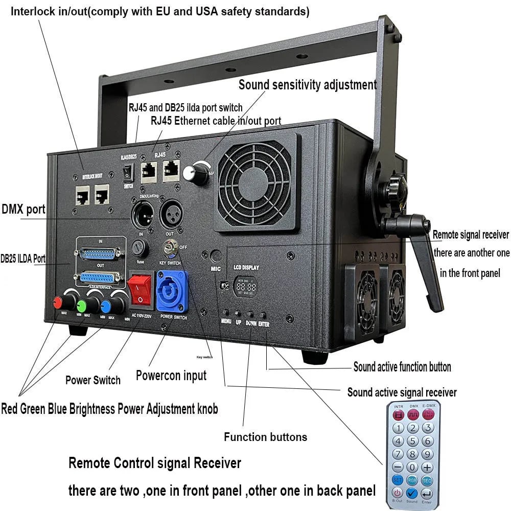 - Pro-Level Versatility: Integrate into any setup. Go full pro with DMX512 and ILDA ports, sync to the beat with Sound-Active mode, or run shows from an SD Card. Also supports Auto, Master/Slave, and Remote Control modes.