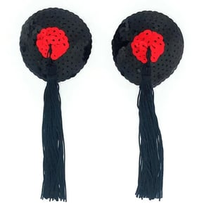 The Black and Red Sequin Tassel Pasties are crafted from high-quality, soft, skin-friendly silicone with a self-adhesive backing. The Round Pasties are decorated with a black sequin outer circle and a bright red sequin inner circle with black tassels falling from the centre.