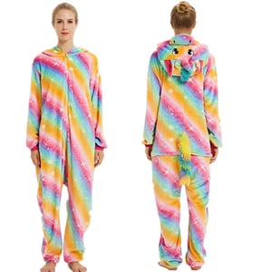 - Full Unicorn Vibe: Features a vibrant rainbow and star pattern, a detailed hood with a horn and ears, plus a fluffy multi-colored tail.