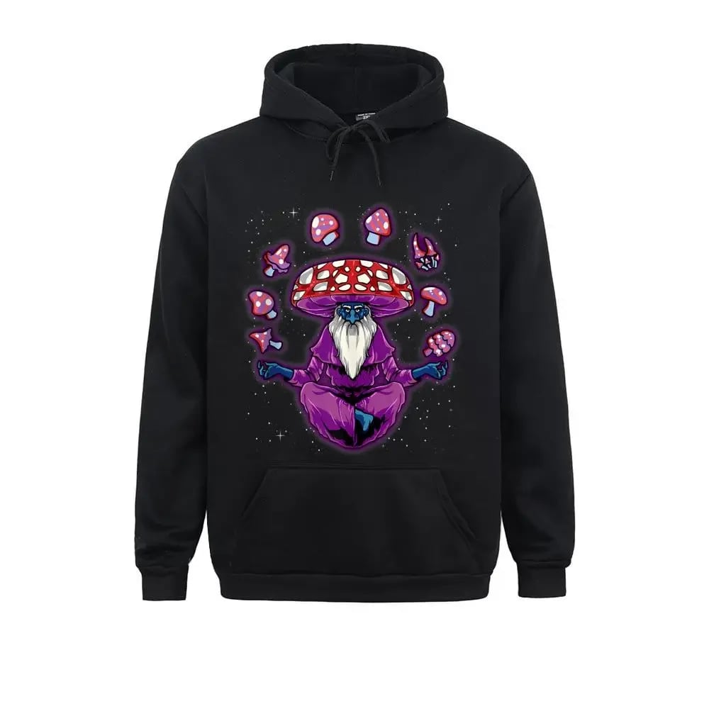 The captivating design illustrates a sage-like figure with a mesmerising mushroom cap hat, peacefully meditating amongst the stars and moving mushroom into the cosmos, symbolising the connection with higher dimensions and the universe.