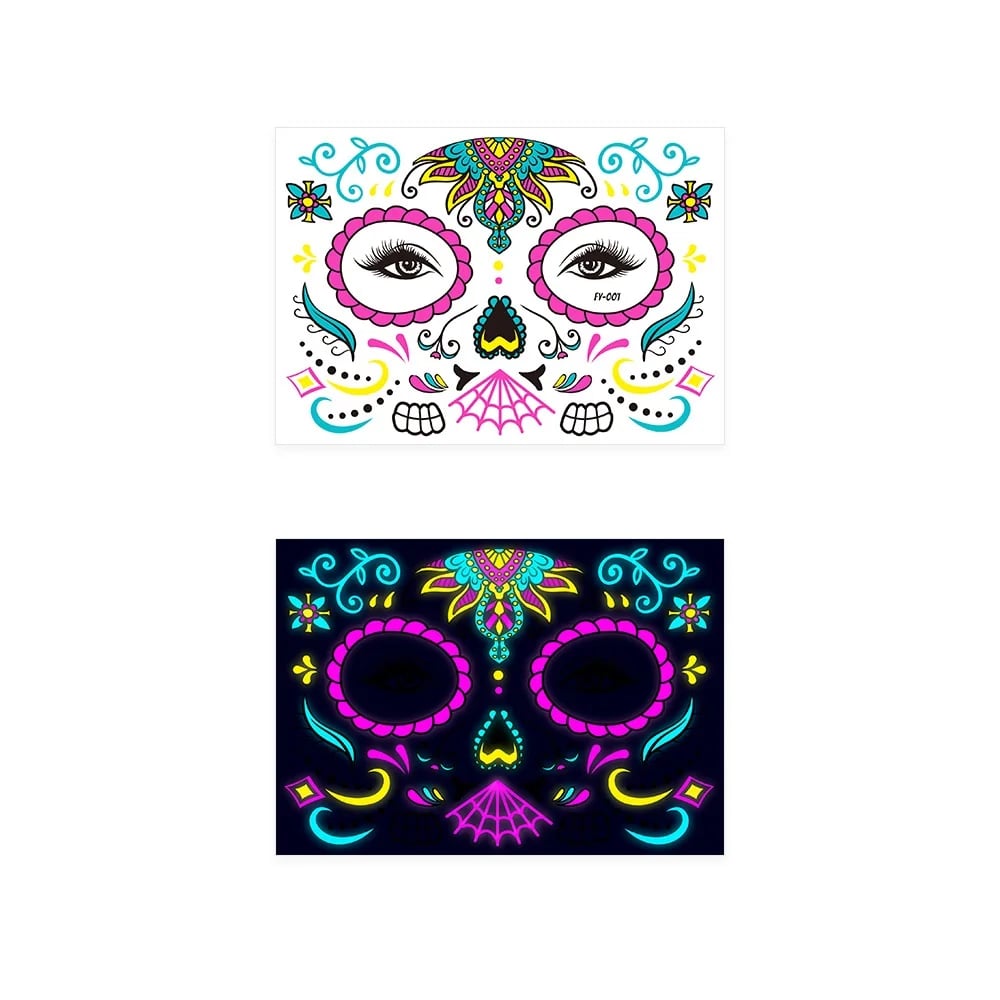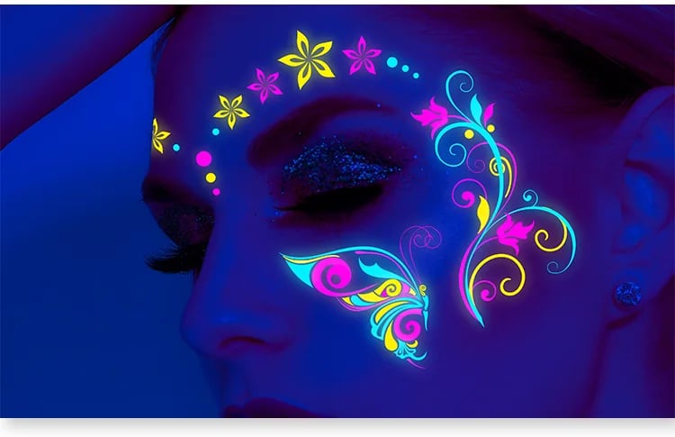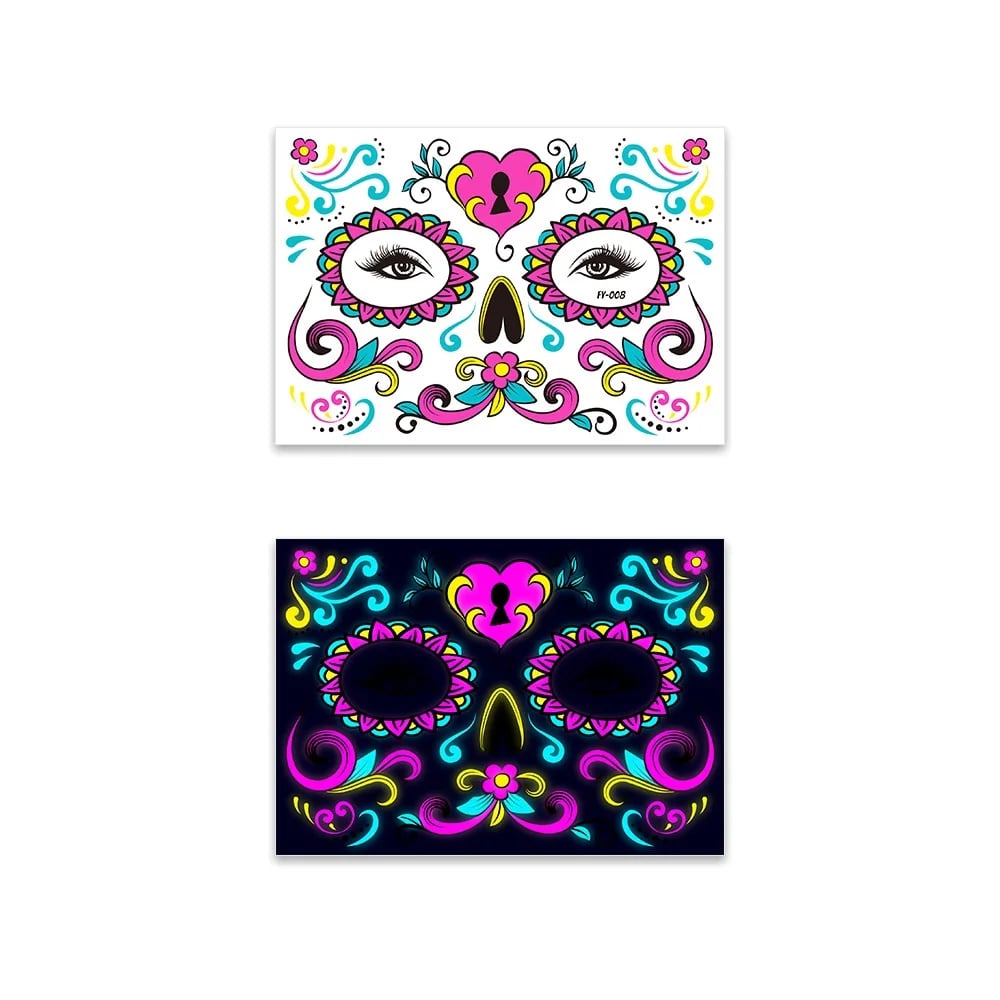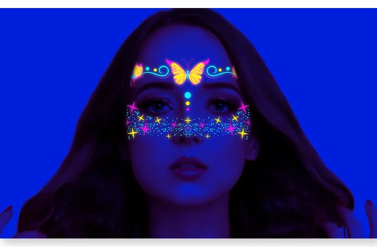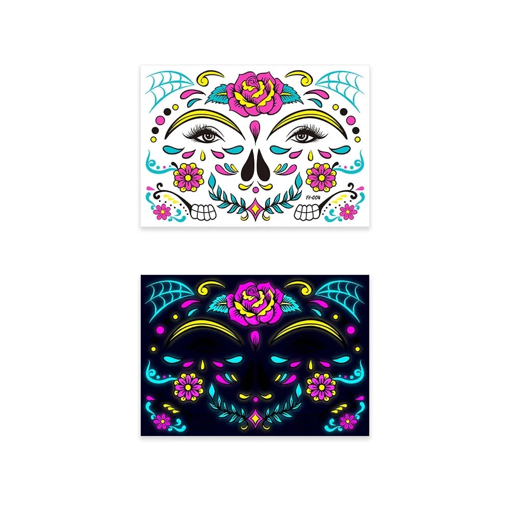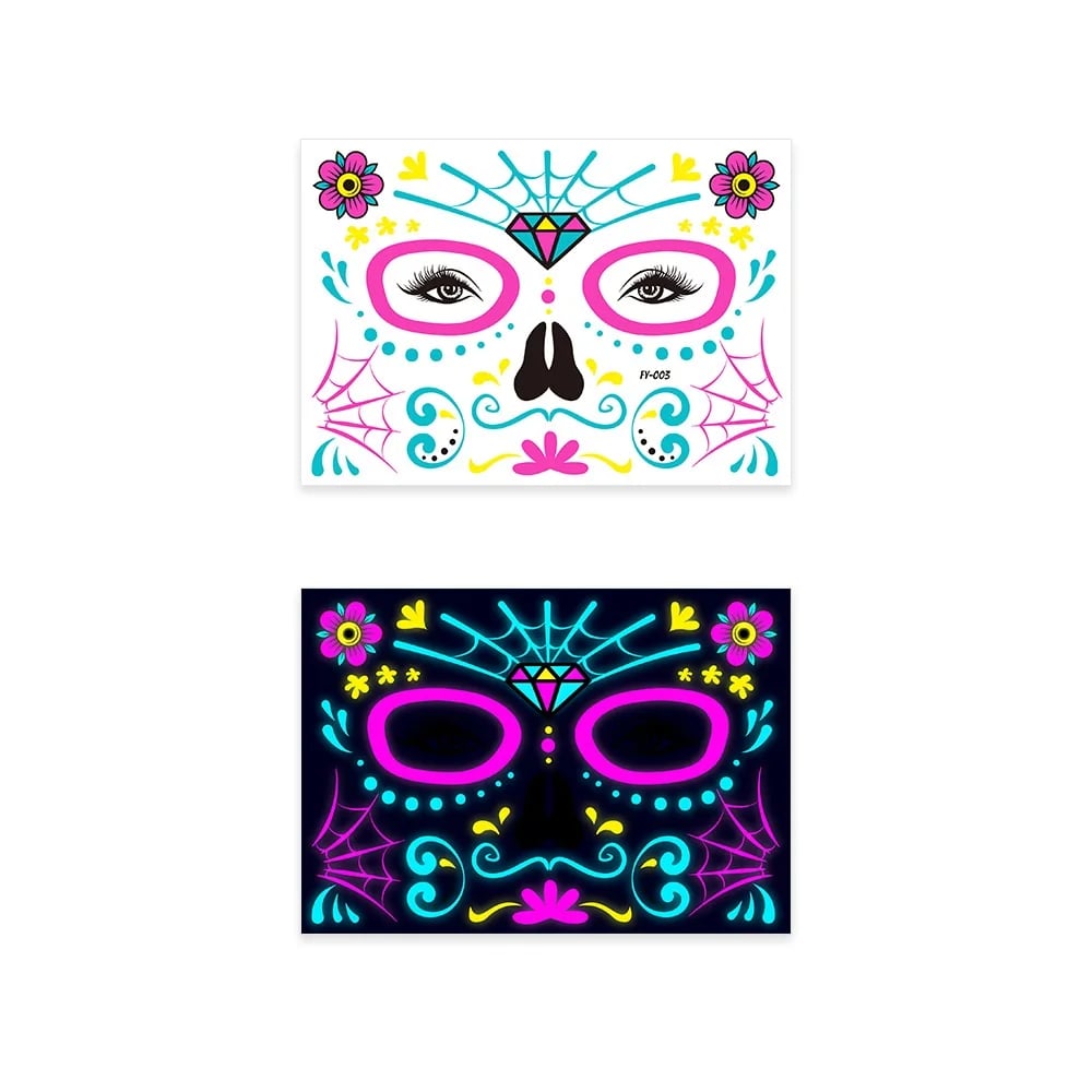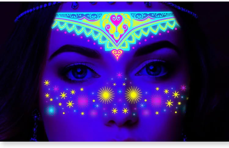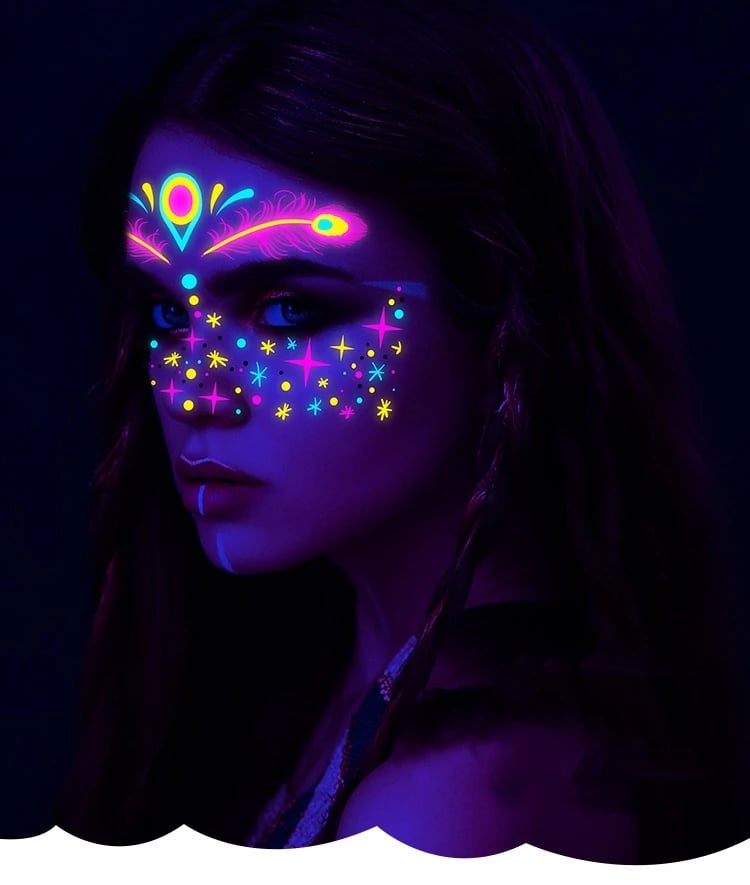 These neon temporary tattoos not only come in bright colours but also glow under UV light. This adds an extra element of fun, face temporary tattoos perfect for music parties, carnivals, Halloween events, bars, clubs, weddings, dances, and other occasions with UV lighting.