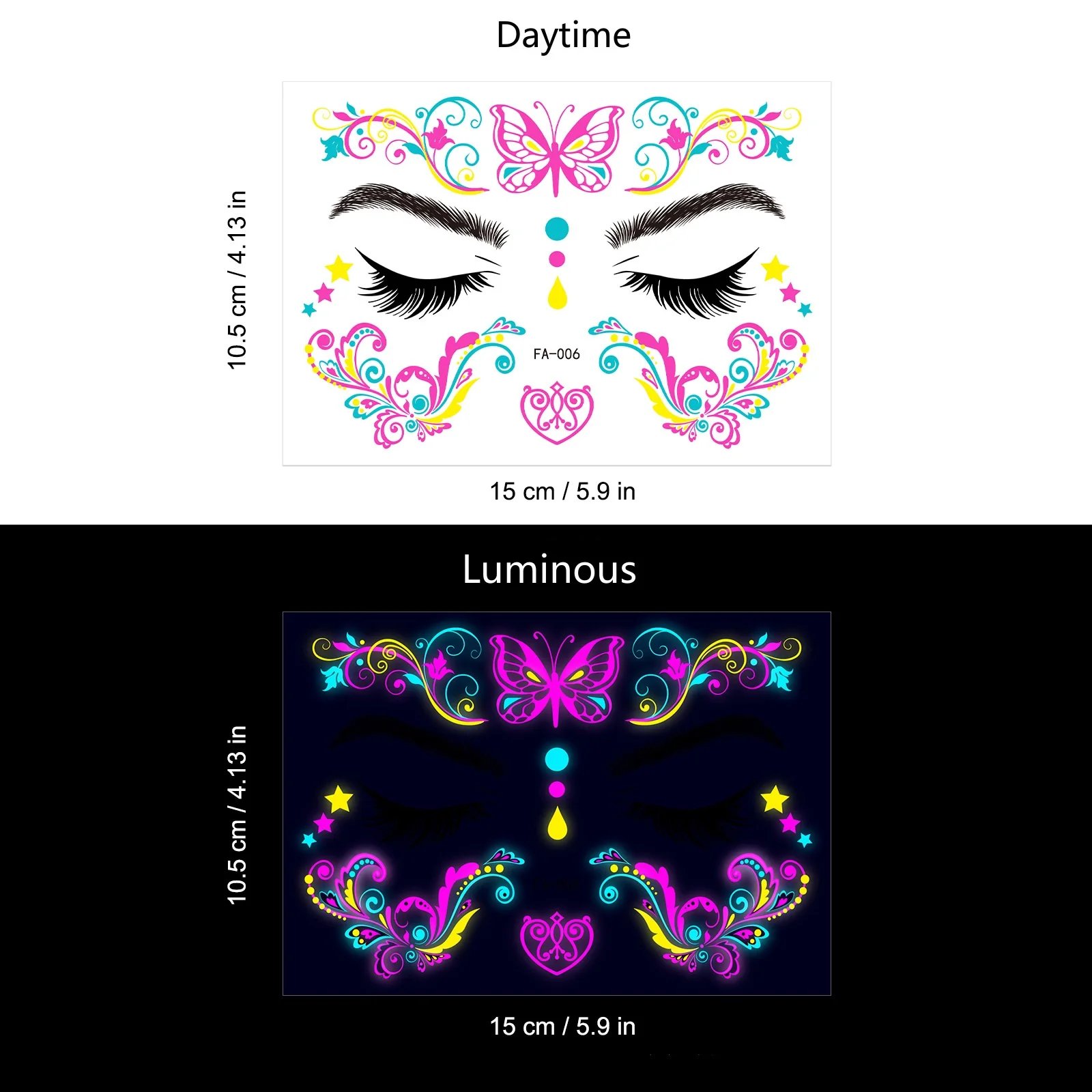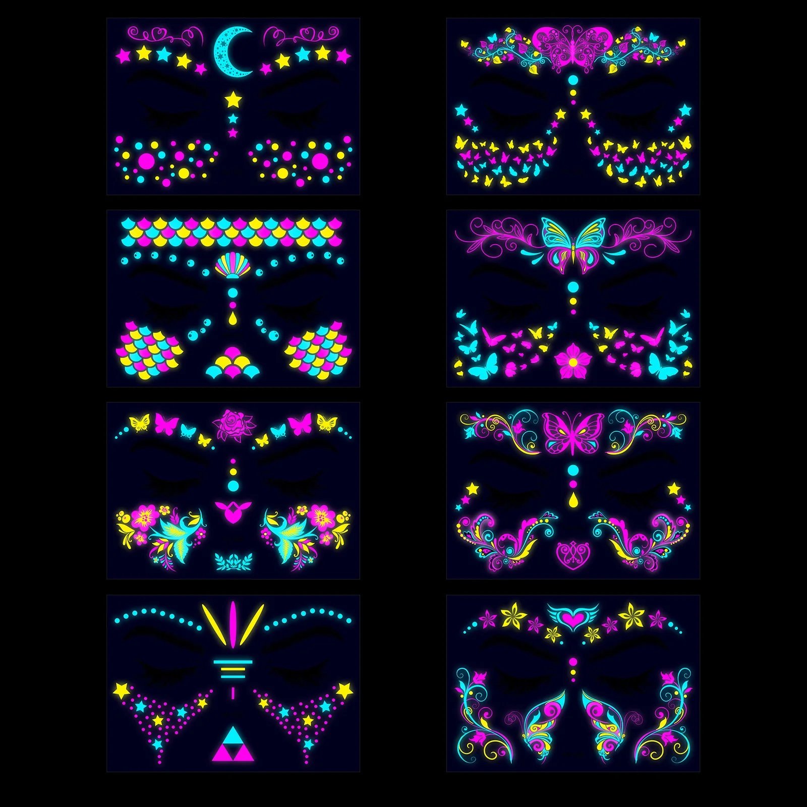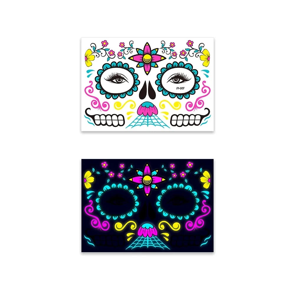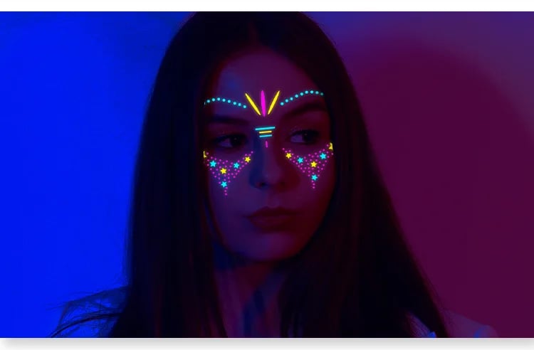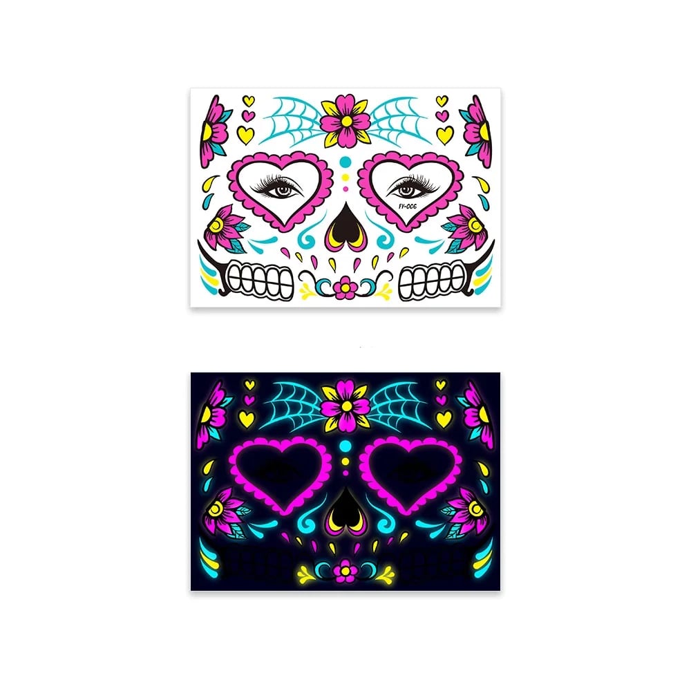 These neon temporary tattoos not only come in bright colours but also glow under UV light. This adds an extra element of fun, face temporary tattoos perfect for music parties, carnivals, Halloween events, bars, clubs, weddings, dances, and other occasions with UV lighting.
