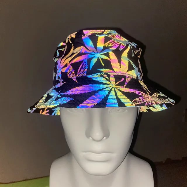 The Iridescent Leaves Bucket Hat features a stunning print that comes to life under flashing lights. It's made with high-quality polyester fabric and has an opening circumference of 58cm.