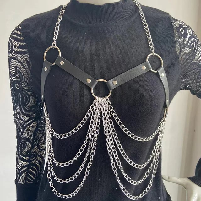 Unleash your inner rebel with the Ravers Co Chain & Leather Chest Harness. This audacious piece, designed for the bold and the fearless, is the perfect accessory for your next rave or festival. Crafted from supple leather and robust chains, this harness is not just a statement, but a testament to your individuality.