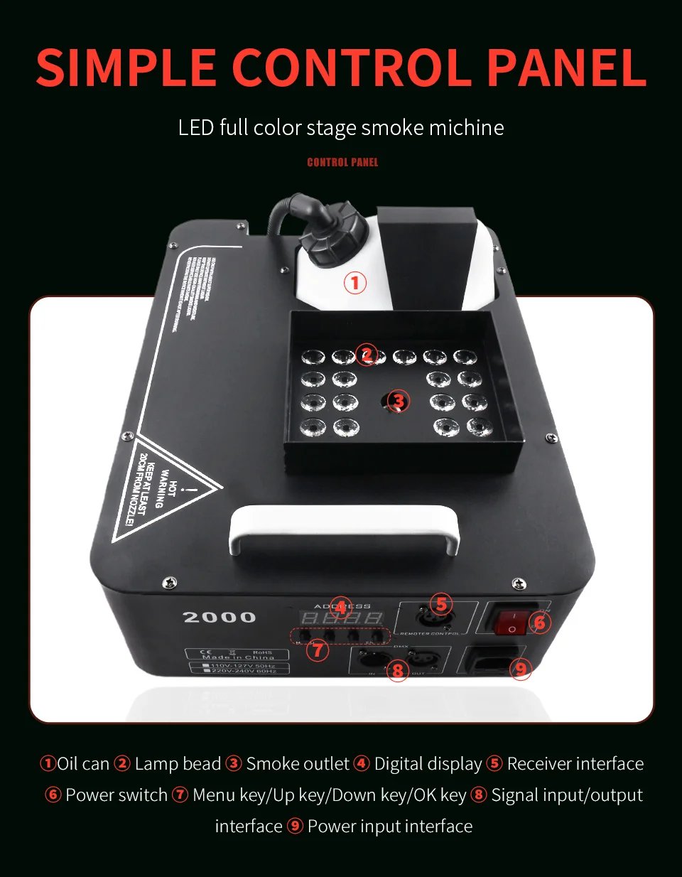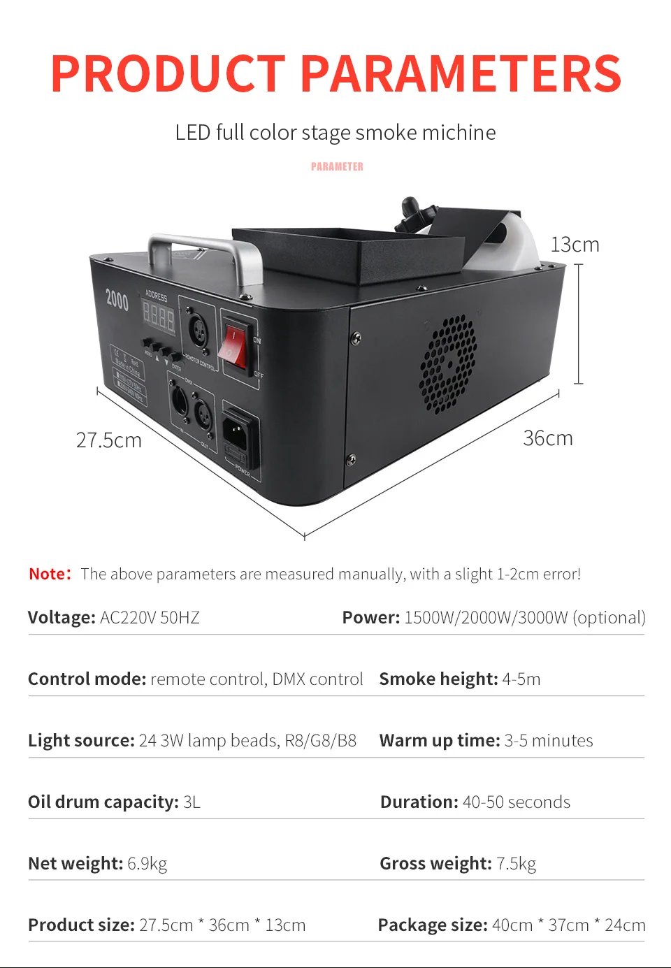 - Dynamic LED Lighting: Equipped with 9W x 24 LEDs, this machine doesn’t just produce smoke; it illuminates it, creating a stunning visual effect that complements your lighting setup.