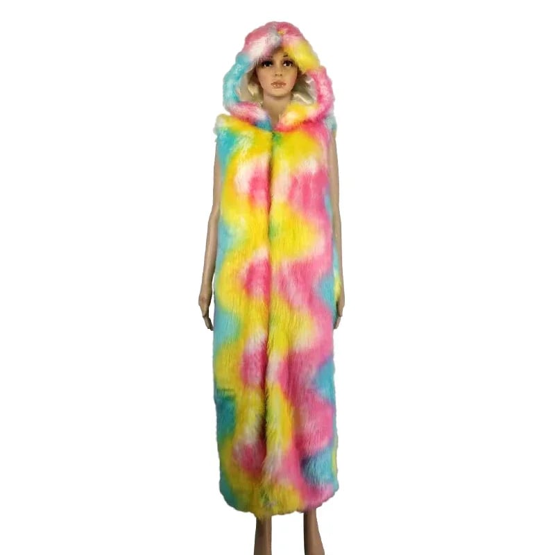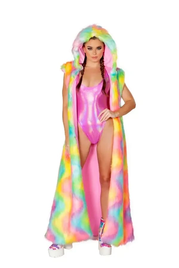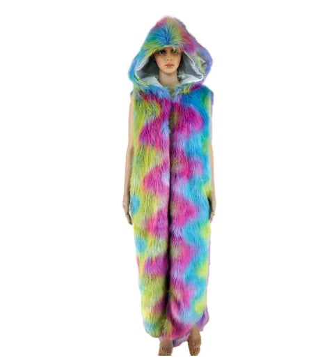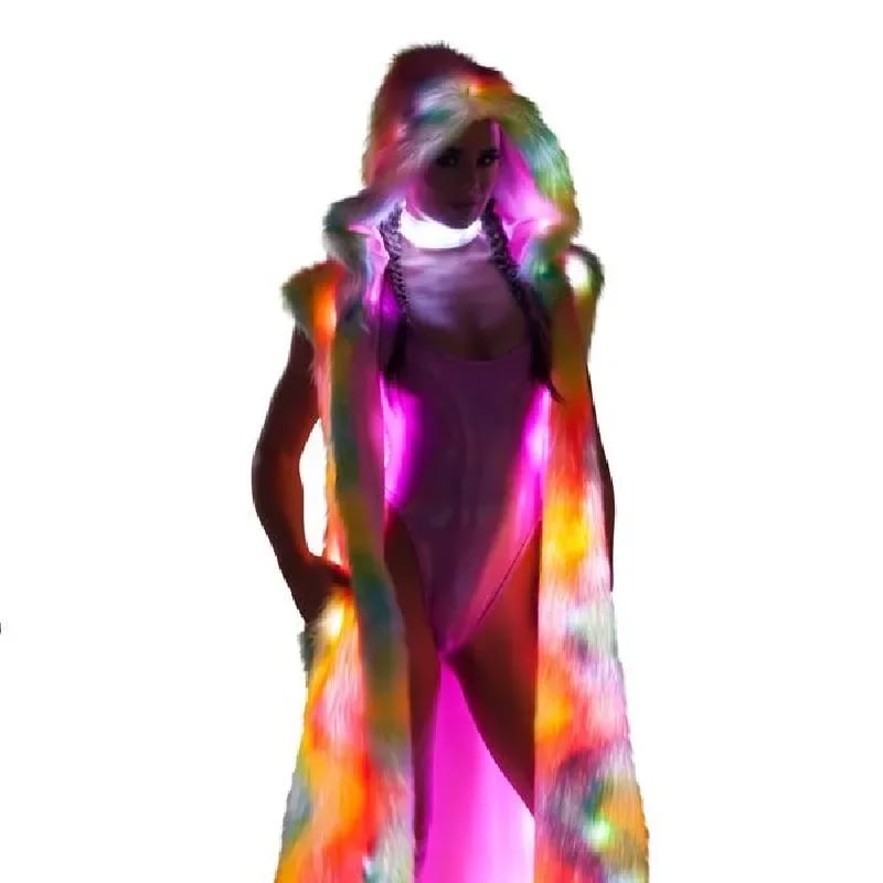 OMG this vest is INSANE! I saw the LED Colourful Fur Vest on Instagram and finally caved. Got the M in the purple fur pattern and it’s even better in person. The polyester faux fur is SO plush and seriously lightweight, perfect for dancing around. The tiny LED bulbs sewn in are super bright and the discreet remote makes it easy to change the colours and effects. Wore it to Rhythm & Vines and got so many compliments! It’s full length with a hood too which was awesome when it got chilly. Just remember those 6 x AA batteries!