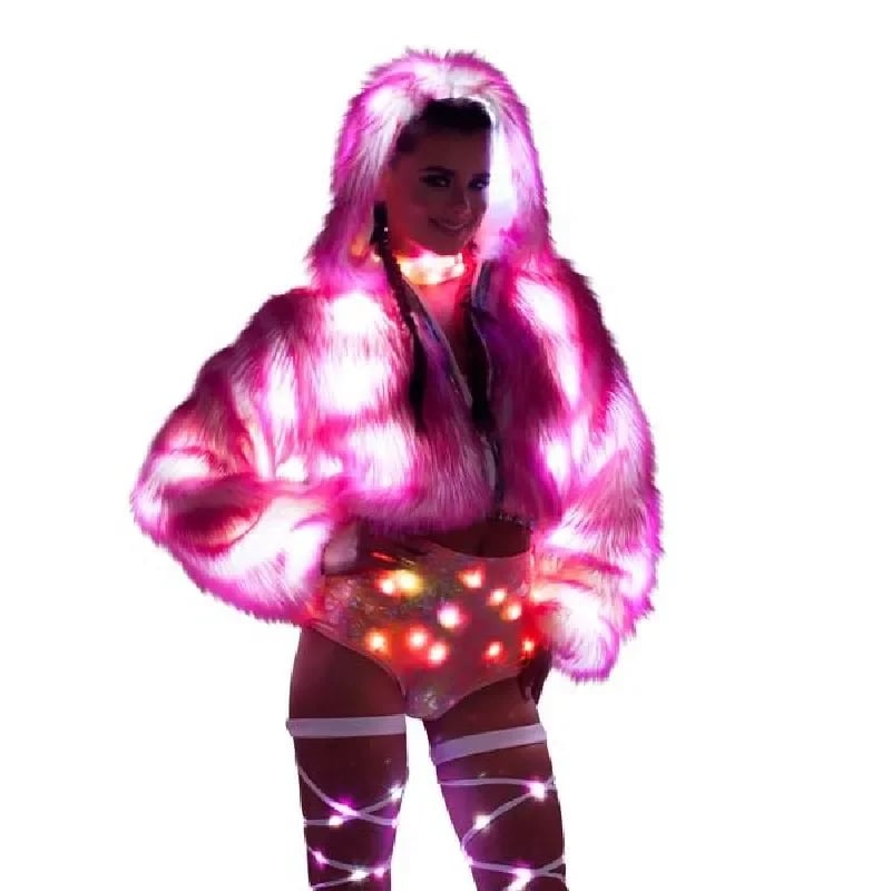 Step into a world where fashion meets tech with our LED Fur Zip-Front Hoodie. With energy-efficient LEDs woven into plush fur fabric, illuminate every room you dance into!