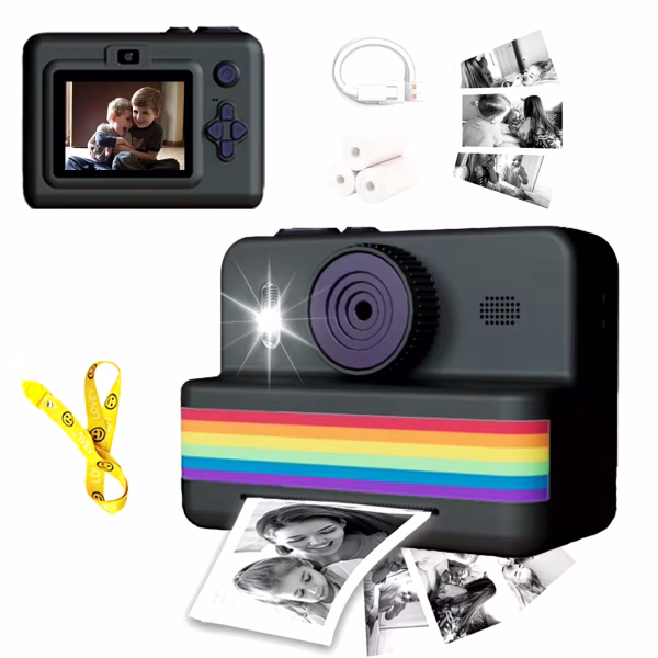 Mini Instant Print Camera: This camera adopts thermal printer technology, just press the button and you can get a black-and-white printed picture in seconds. Upgraded 180° rotating camera design allows you to take pictures or selfies.