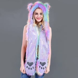 The Pastel Rainbow Cat Spirit Hat is perfect for Raves and Festivals. It features a cute animal-inspired hood, a scarf, and mittens all rolled into one. Made from pastel coloured luxe faux fur and a smooth white lining, this cat hat comes to life under UV lights.