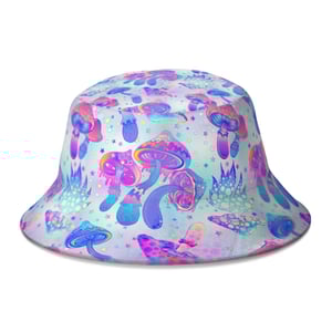 The Pink Mushroom Bucket Hat features a psychedelic, pink and violet coloured, mushroom print on white polyester fabric. The 58 cm circumference will fit most. It's perfect for Raves and Festivals.