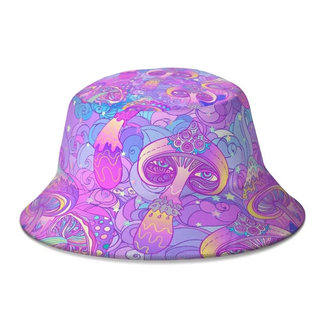The Dreamy Mushroom Bucket Hat is the perfect accessory for Raves and Festivals. Featuring a pastel purple coloured mushroom print on polyester fabric. 58cm circumference will fit most.