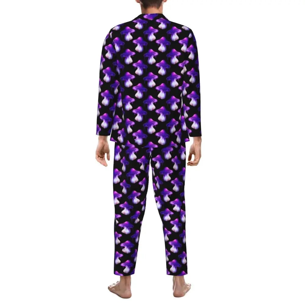 The Purple Cap Mushroom Pyjamas are made from Soft, Skin friendly, Poly Broadcloth fabric that is light weight and breathable. They have an elastic waistband and pockets. This set features a repetitive Purple Mushroom Print on a dark background. Available in S, M, L, XL, XXL.