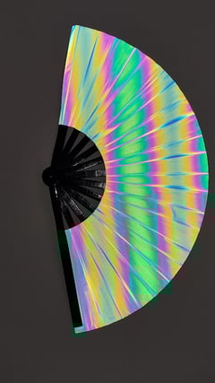 The Rainbow Aura Hand Fan is created with a bamboo skeleton and an awesome iridescent fabric with a trippy rainbow aura print. This fan comes to life under flashing lights, making it truly magical! It's approximately 33cm long with and open width of about 65cm.