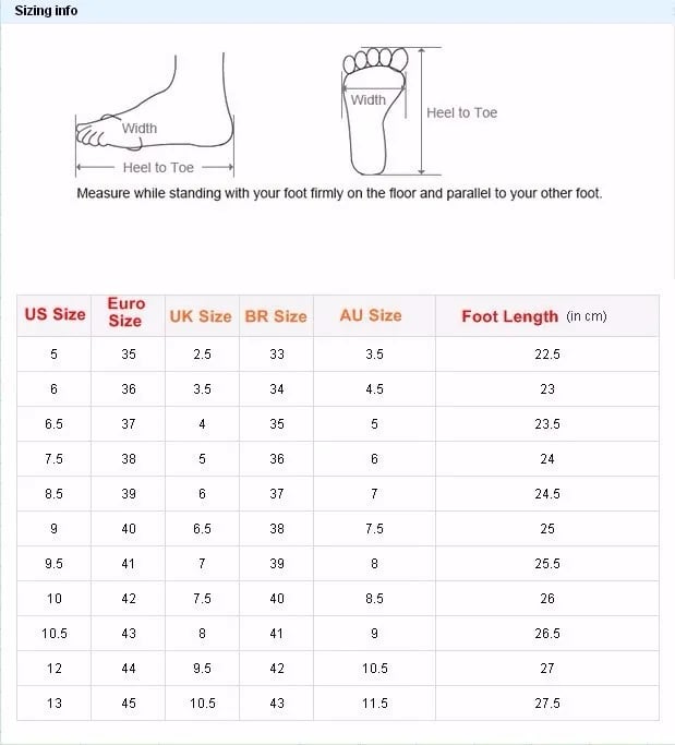 - Check the size charts of individual shoe listings. If one foot is longer than the other; go for the size of the longer foot. If your feet are wider, it is recommended to get a pair of shoes half a size to one size larger.