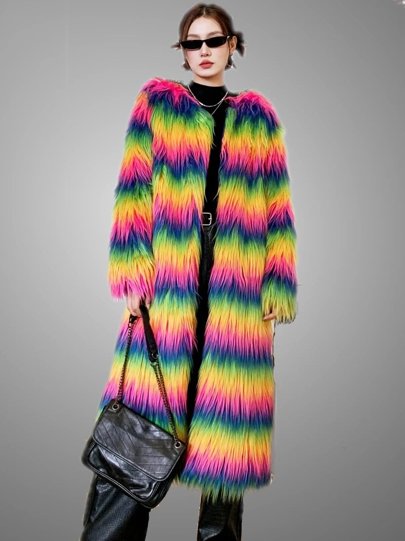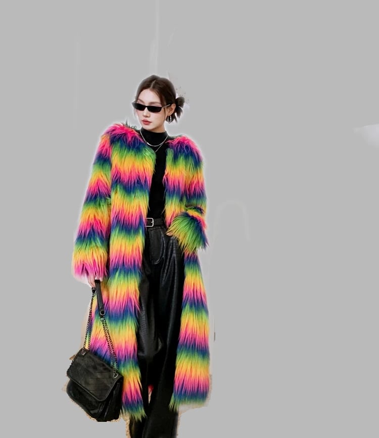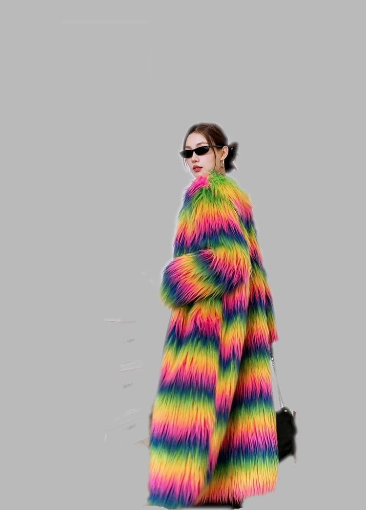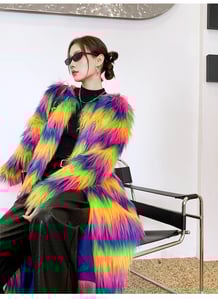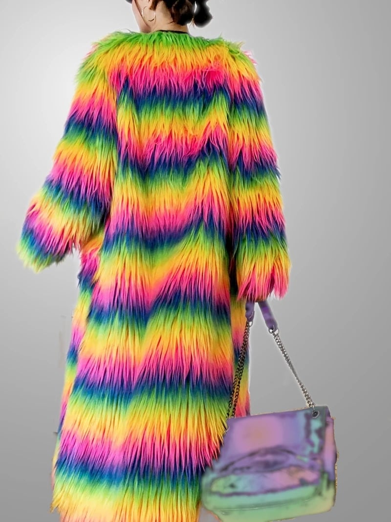 The Neon Rainbow Furry Coat is made with Plush, Neon Coloured Faux Fur. This coat is available in sizes S - XL
