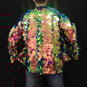 The Sequin Mesh Rave Coat is a lightweight mesh coat covered in large round sequins. It comes in one, large loose fitting, size, and it's available in six different holographic colours.