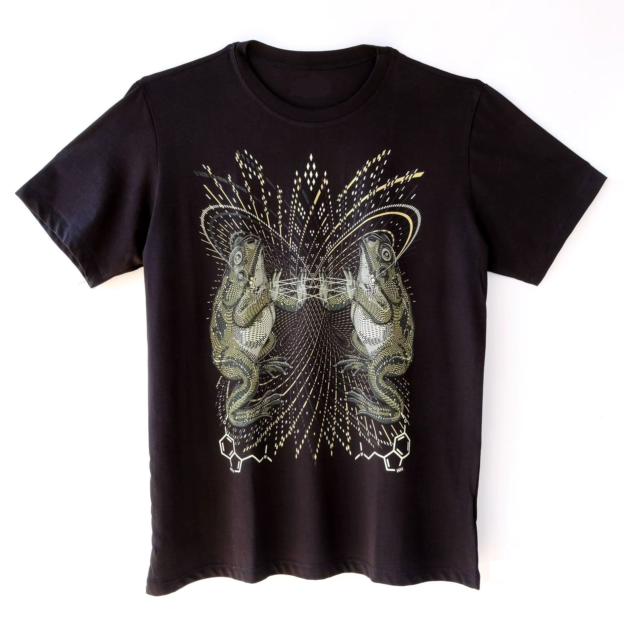 Been eyeing this UV Active Bufo T-Shirt for weeks and finally pulled the trigger. The trippy two toads print is awesome and the UV effect is strong. The Cotton Broadcloth feels durable. I got the XXXL for an oversized fit and it’s perfect. Only wish it came in more color options than just black, but still happy with it! Took about 14 days to arrive in France.
