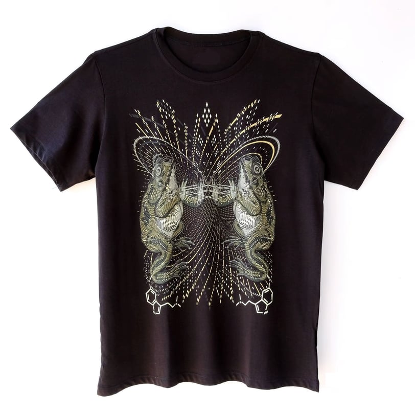 The UV Active Bufo T-Shirt features a Ultra Violet print of two toads. The trippy print is UV Active. Made from Cotton Broadcloth and available in size S - 6XL. Please check the size chart before you purchase.